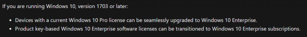 First of all, there is a licensing requirement. You need at least a Windows 10 Pro or Windows 10 Pro Education. You need one of these licenses! There is no way to use the Windows 10 Enterprise subscription without a base license, because it’s an upgrade!